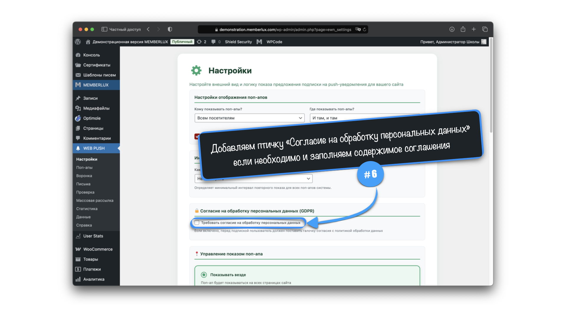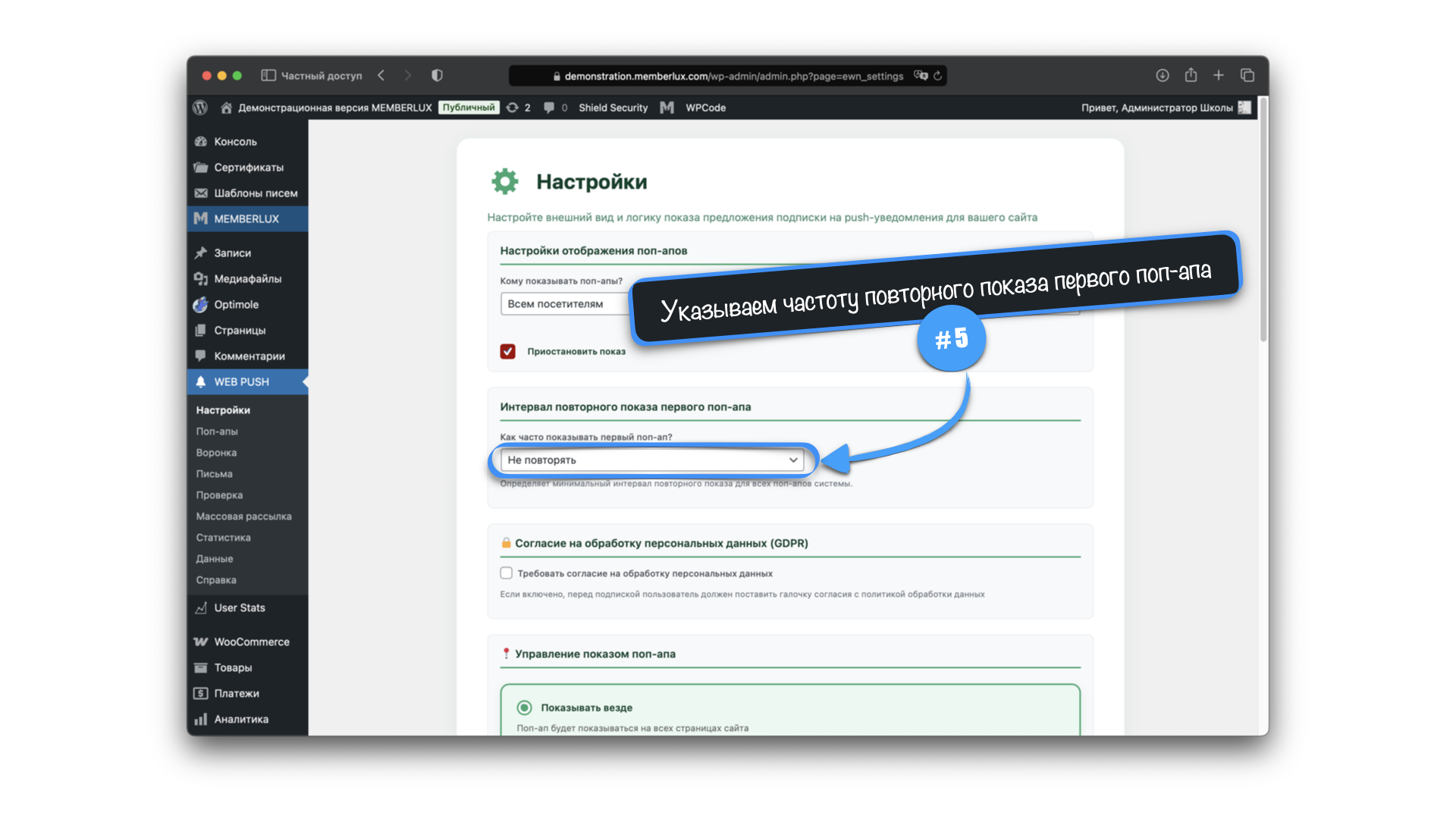 В этом разделе настраивается вывод поп-апов, исключения из вывода, политика обработки персональных данных (GDPR) а так же логика повторения воронки поп-апов.