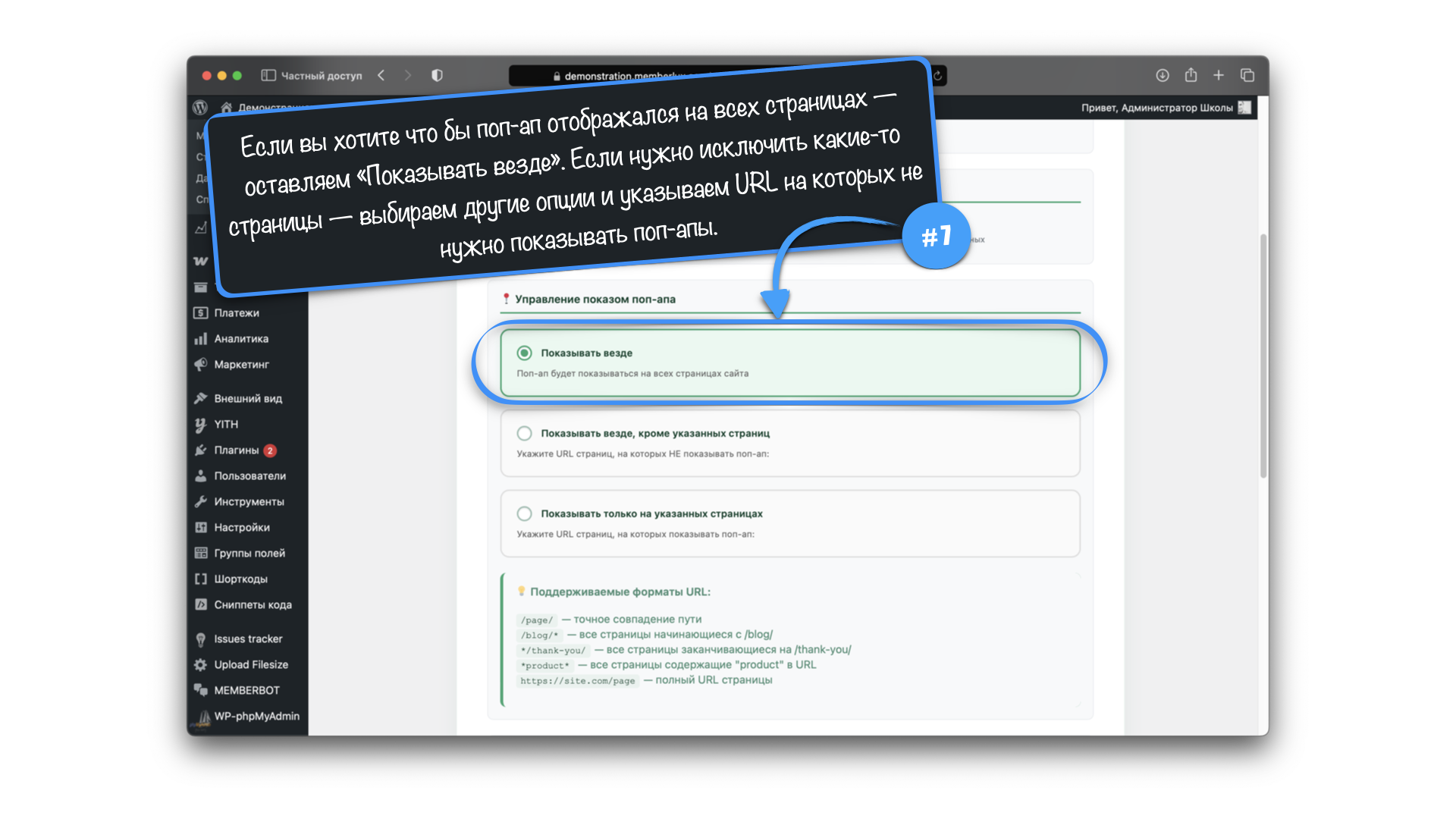 Таким образом мы можем указать в данном блоке настроек, кому и на каких страницах отображать ВСЕ поп-апы, да, данная настройка влияет на все поп-апы. В описание следующей настройки поймете почему.