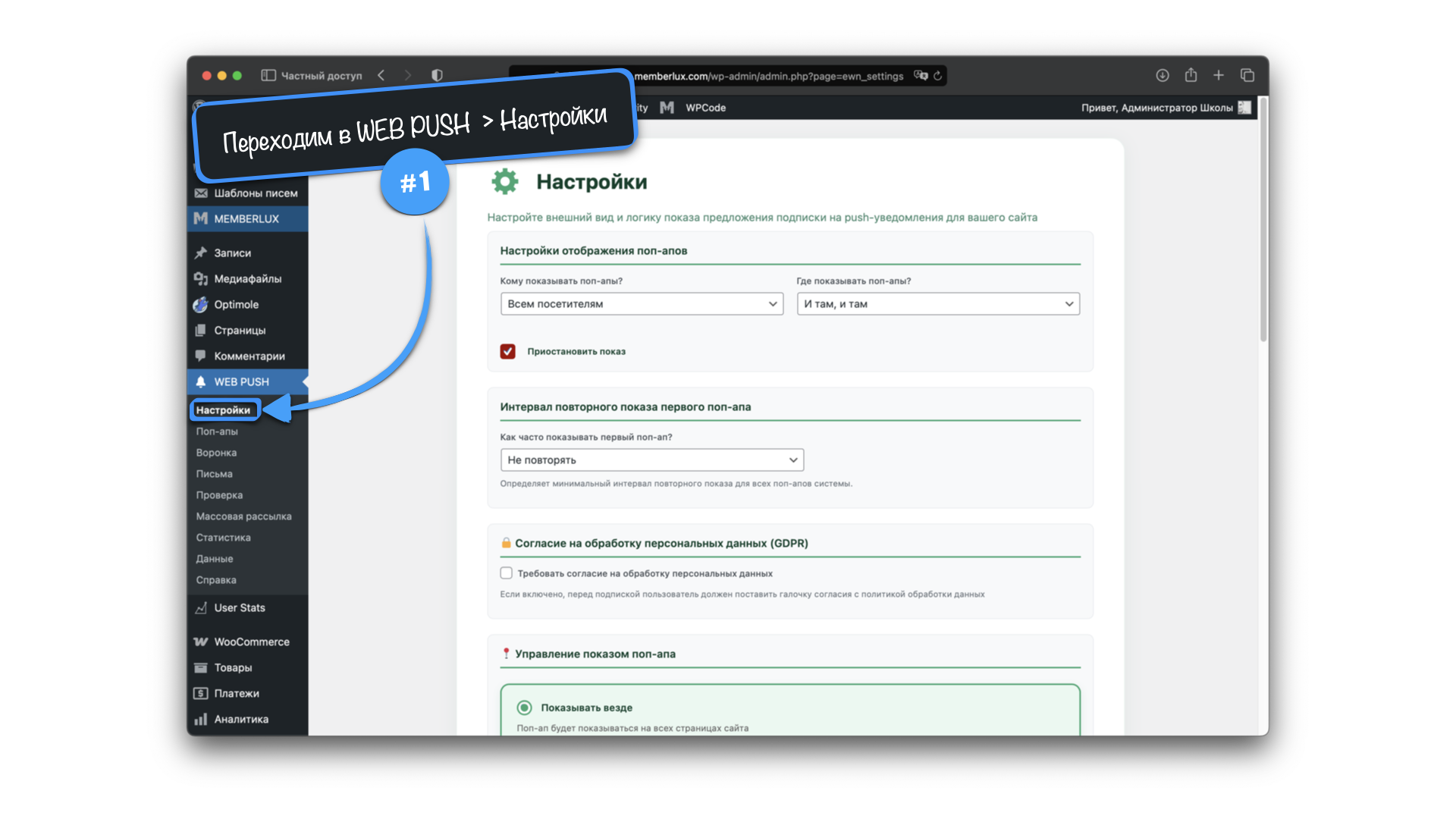 Устанавливаем системные настройки работы системы Поп-апов
